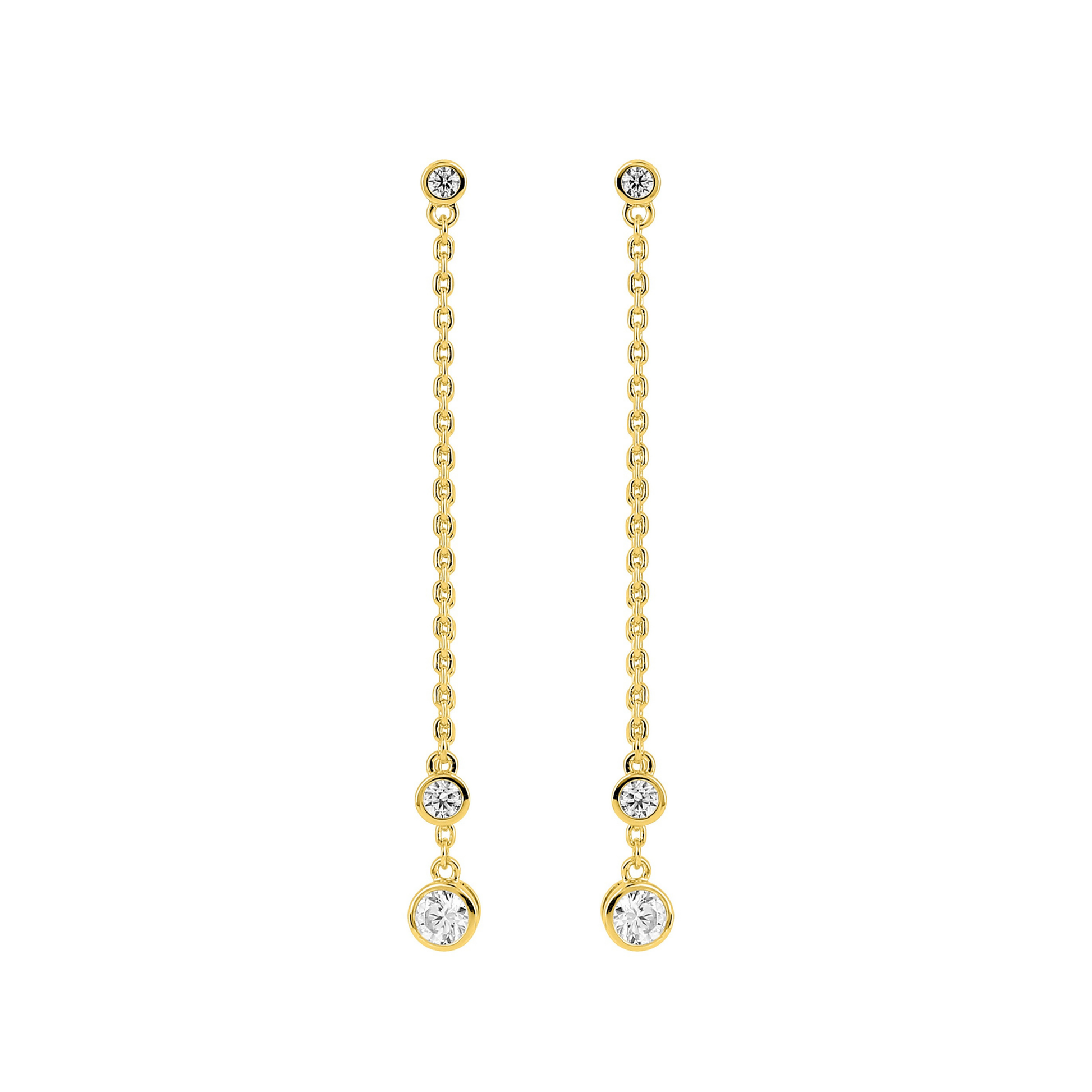 Alizée allonge la ligne du visage avec deux chaînes fines et mobiles. Légères et aériennes, ces pendantes twistent une tenue simple. À porter seules ou en mix & match, du jean au soir.